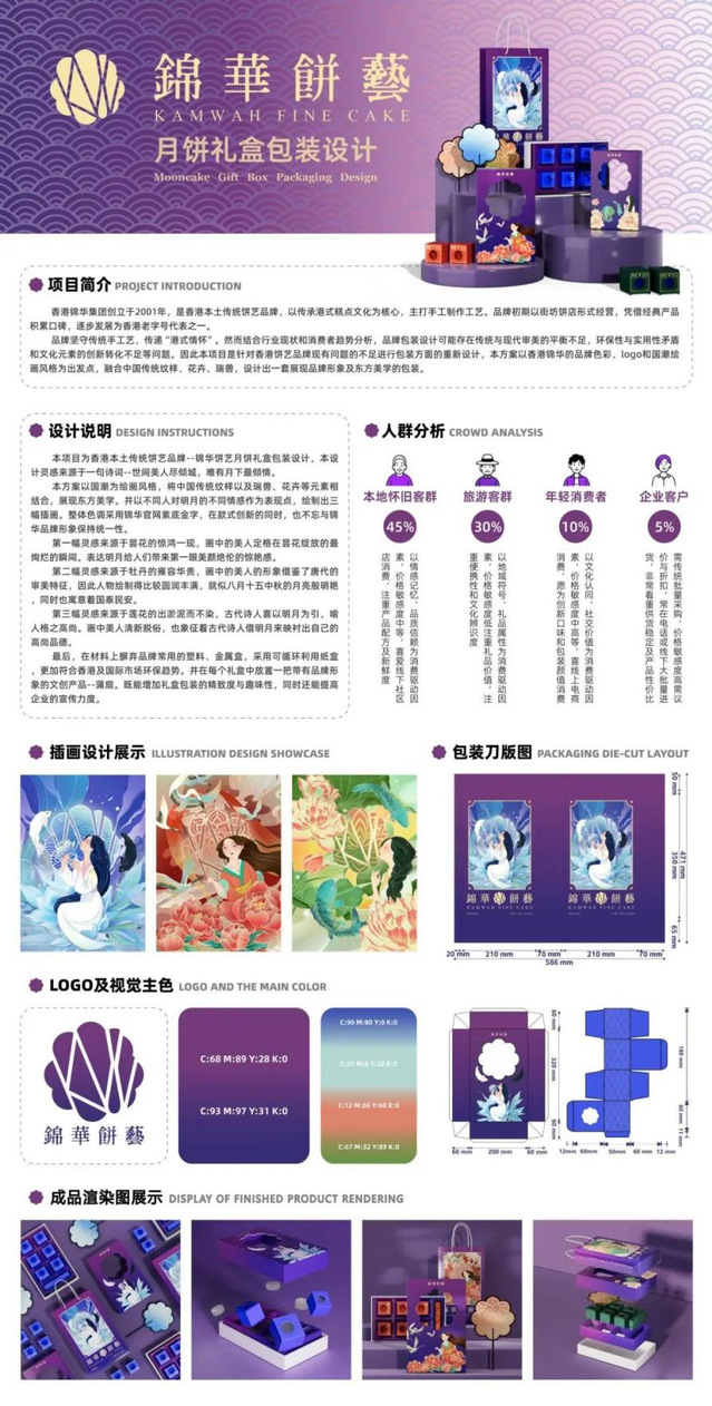 何炜杰作品以中式美学为内核,将古典诗词意境融入月饼礼盒设计,通过水墨元素与几何线条的结合,诠释了“月下美人”的浪漫意象,既传统又时尚,彰显文化自信。