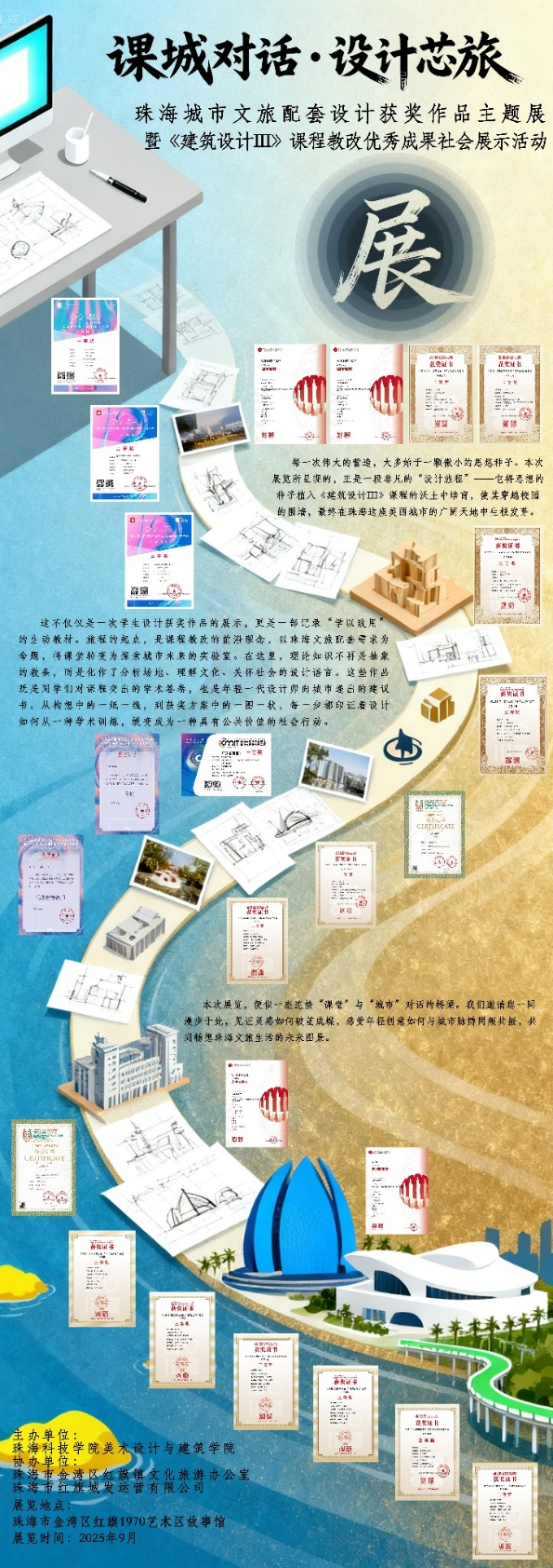 为建设好广东省高等教育研究和改革项目,美术设计与建筑学院教改项目——“基于项目制在《建筑设计Ⅲ》课程教学改革与实践”项目负责人林俊航老师组织了建筑学专业三年级教研组全体任课教师范怡弈、周奕、王薇,并联合珠海市金湾红旗镇文旅办及珠海市红旗城发运营有限公司一起、于2025年9月19—25日在珠海红旗1970艺术区糖厂故事馆举办一场题为“课城对话·设计芯旅——珠海城市文旅配套设计获奖作品主题展暨《建筑设计Ⅲ》课程教改优秀成果社会展示活动”的校外展览,展出内容为《建筑设计Ⅲ》课程教改成果的优秀设计作业及竞赛获奖作品共80份。